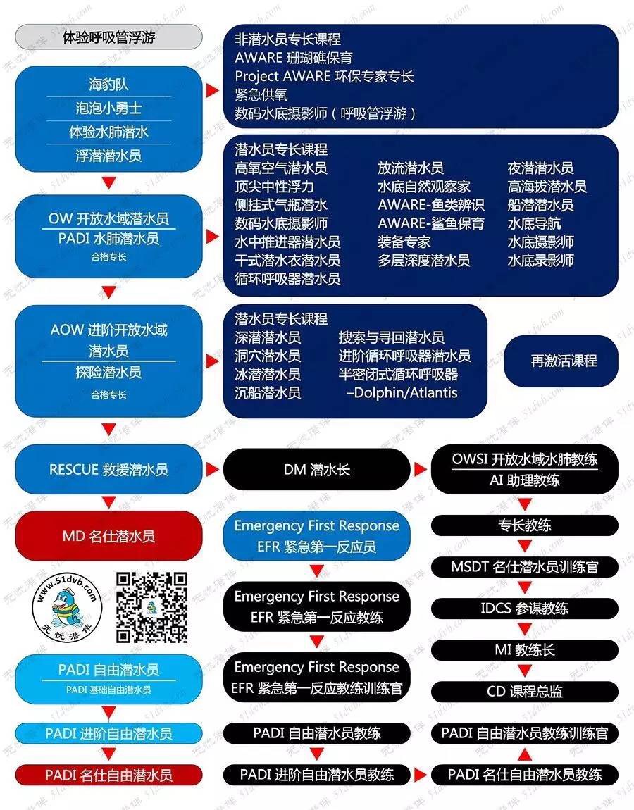 AOW進階開放水域潛水員,要求五項潛水專長,例如船潛、夜潛...........等。限制水下30米以上潛水。
